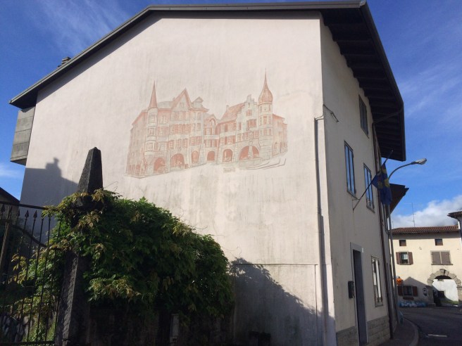 Le temps clair sur Tolmezzo ce matin, en dépit de la météo, était une première surprise. Trouver la fontaine du banneret de Bienne représentée sur une maison de Caneva en était une autre.