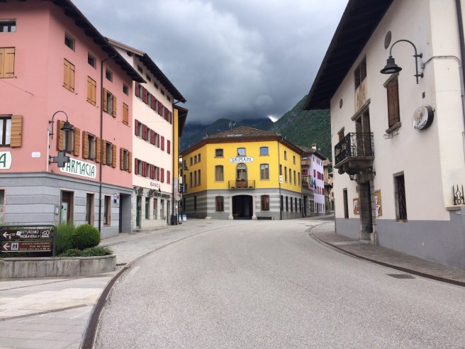 Les petites routes et pistes cyclables empruntées aujourd’hui ne s’approchaient guère des montagnes qui bordent la vallée du Tagliamento. Dommage pour cette cascade, malheureusement prise à contre-jour.